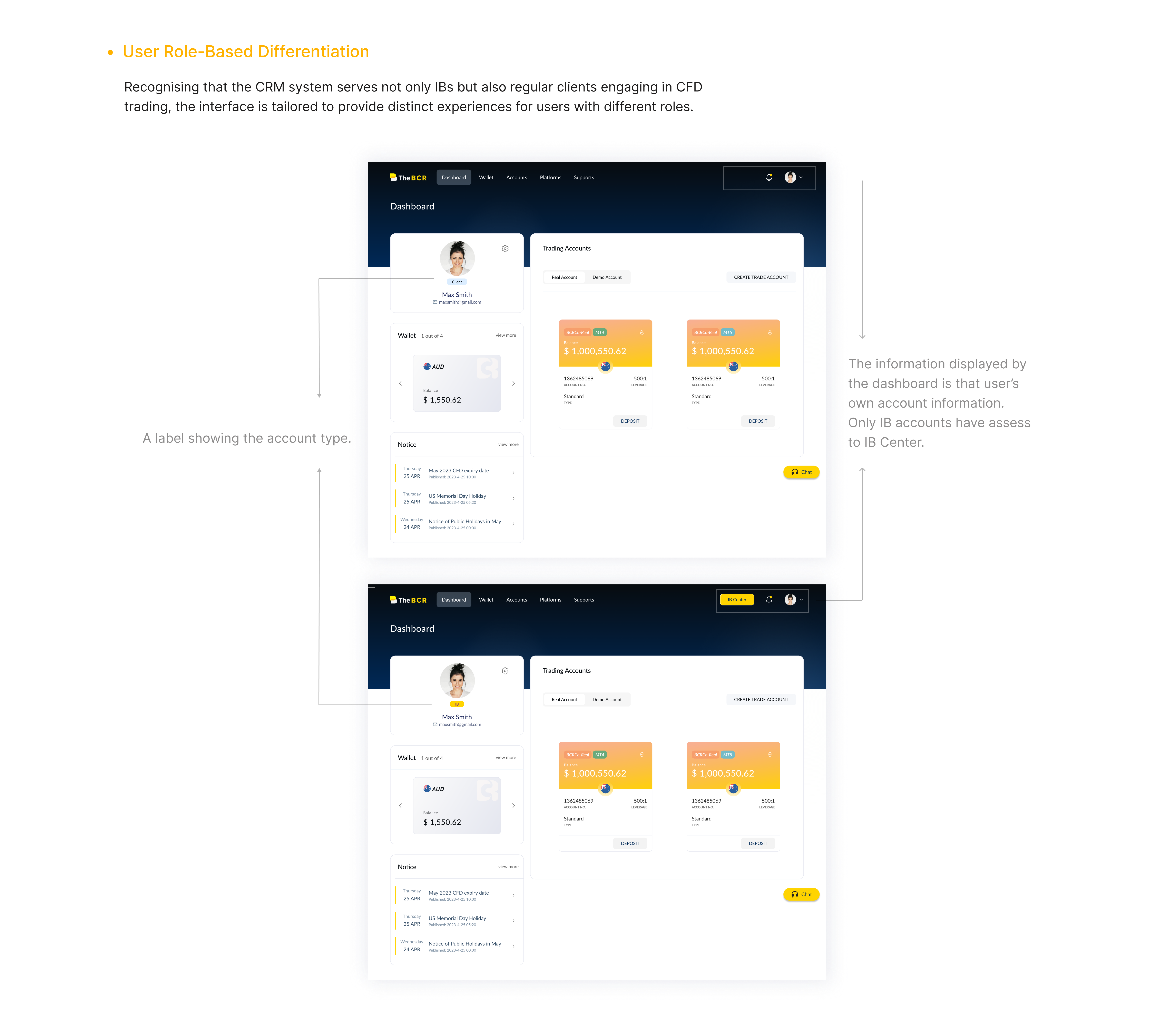 The objective of this UX project is to design a CRM system for BCR, a foreign exchange company, specifically tailored for Introducing Brokers (IBs). The CRM system aims to provide IBs with the ability to track and monitor their clients' activities, including deposits, withdrawals, and trading transactions. The goal is to create an intuitive and user-friendly interface that facilitates efficient management of client accounts and enhances the overall user experience.