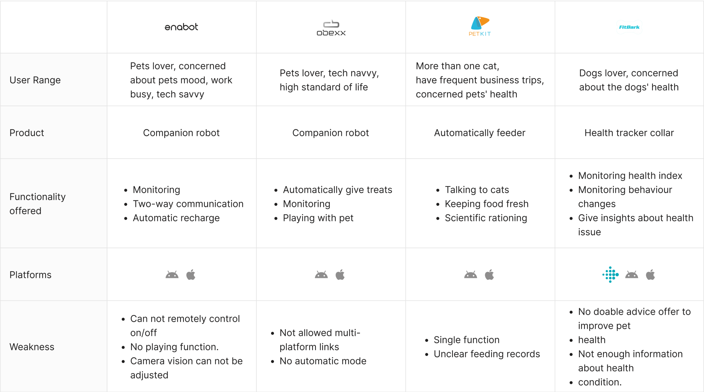 Competitive analysis was conducted to determine the features, strengths, weaknesses and user feedback of the smart pet products currently existing in the market to inform MEOW's features and information structure.