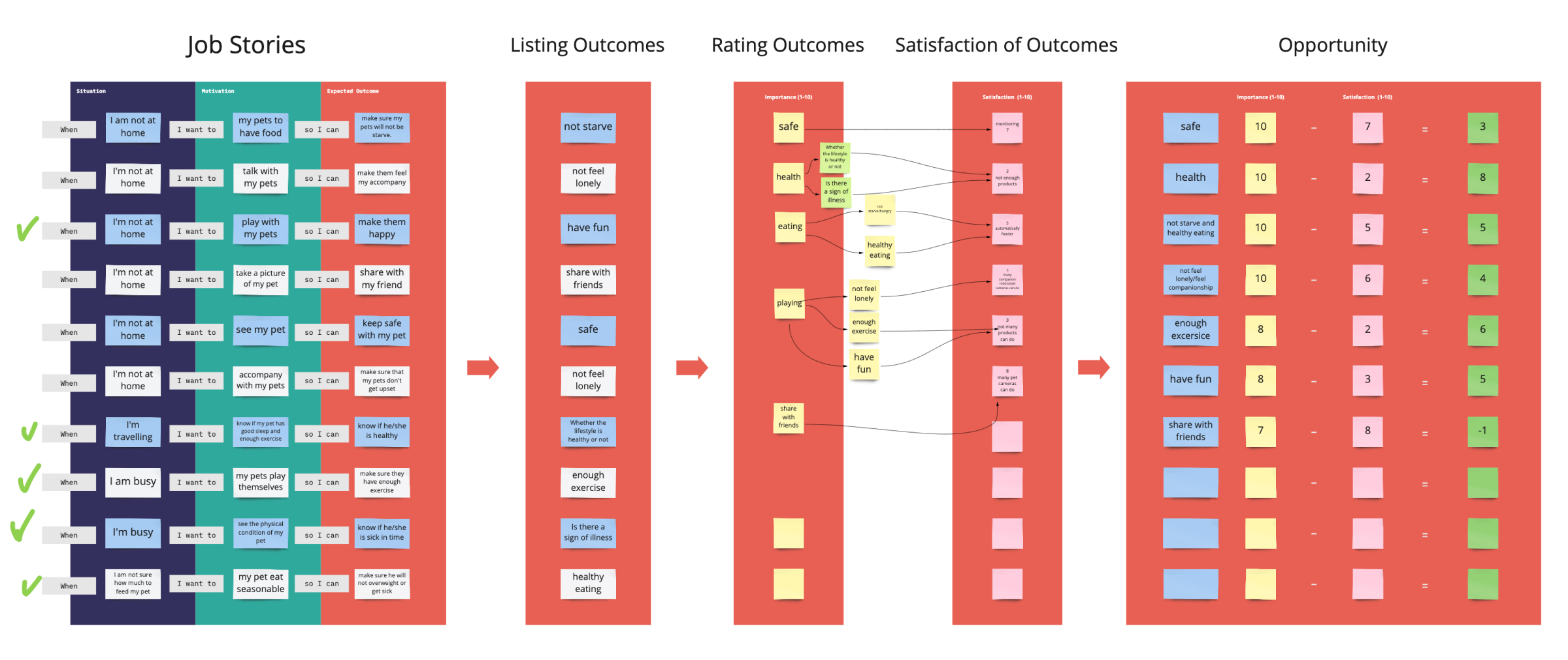 Combining key insights from the preliminary analysis, Job To Be Done was conducted to rank the outcomes and satisfaction, and got some design opportunities to focus on. The results showed that health was the most important user concern and needed to be addressed, followed by the play and feed.