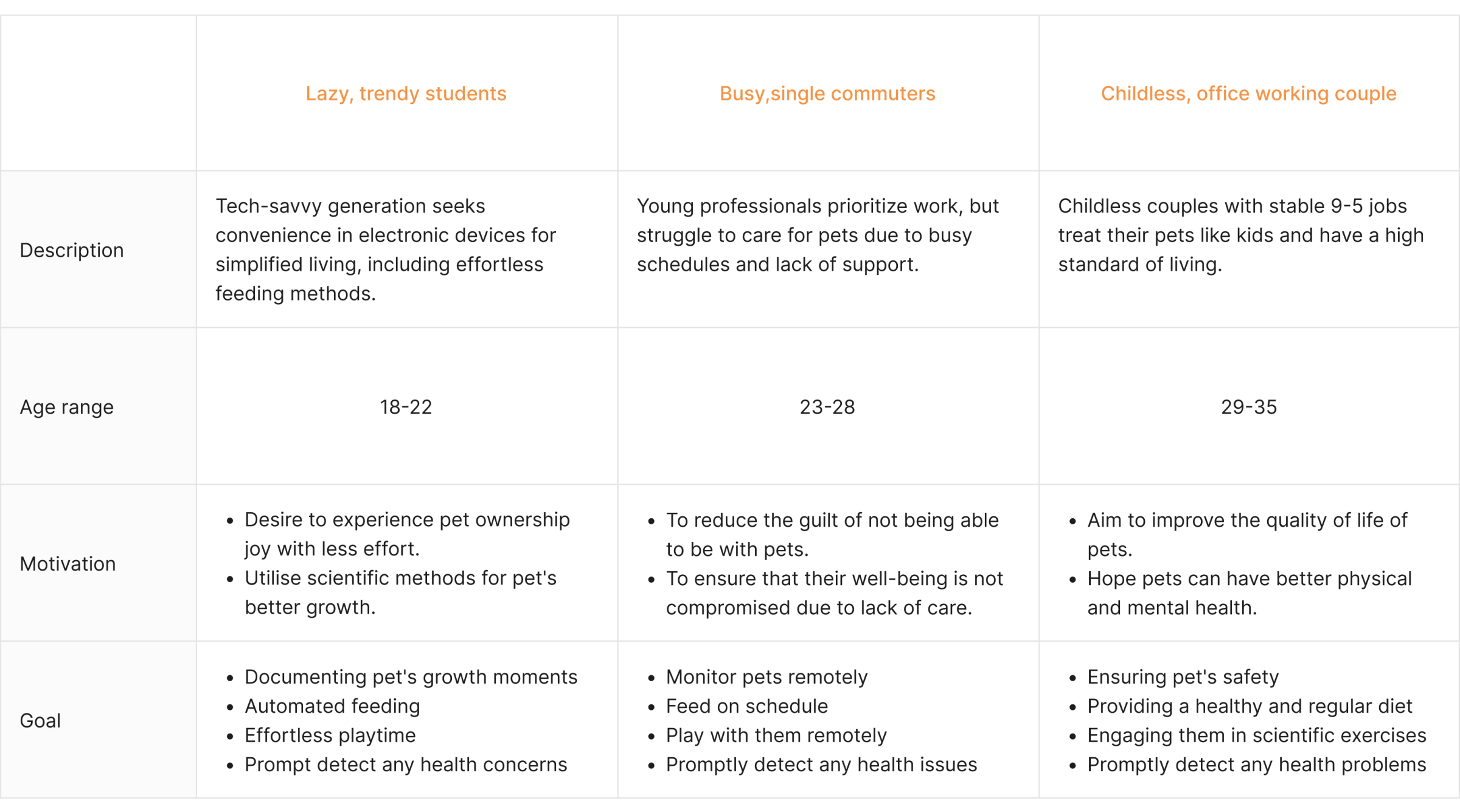 Initial research focused on identifying target users for the robot pet sitter through background research to better understand the user's needs in terms of pet keeping as well as measuring the importance of these needs within the target user group.